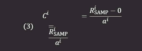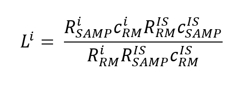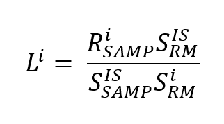 I would agree with the equation you show for Li, which is just the count rate of the sample divided by the sensitivity of the RM (this is the same as dividing by the slope in the more traditional calibration curve approach), and then multiplying this by a sensitivity ratio for the Int stds between the RM and the sample. I would just rearrange it to:
